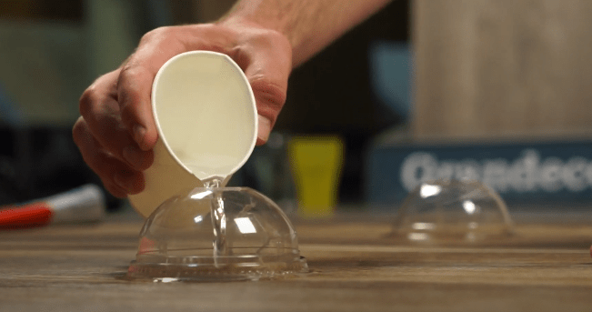 Беремо ємності і робимо позначки маркером на кожному зразку ламінату. Далі для того, щоб вода не виливалася з судин використовуємо німецький герметик Click Guard